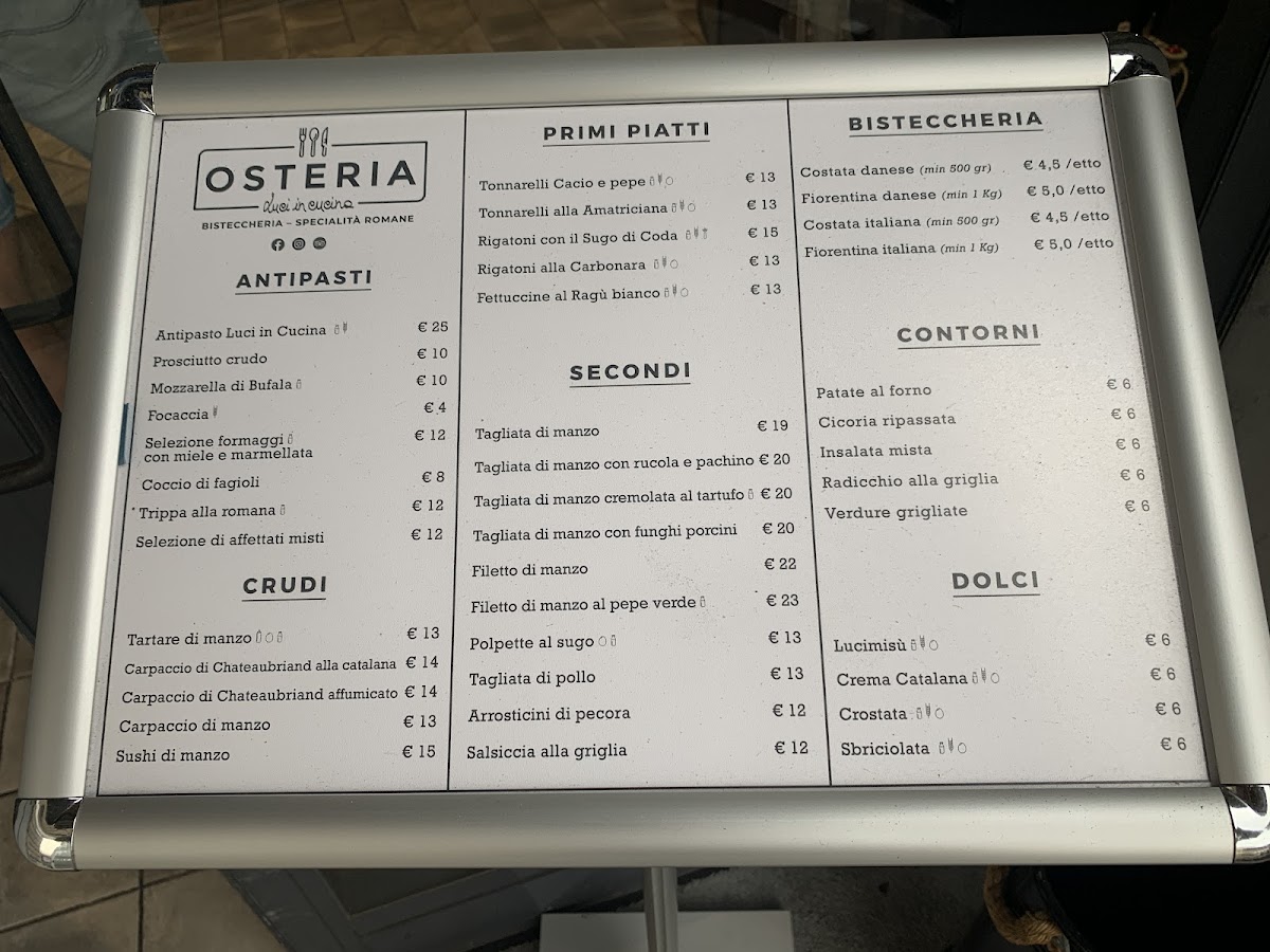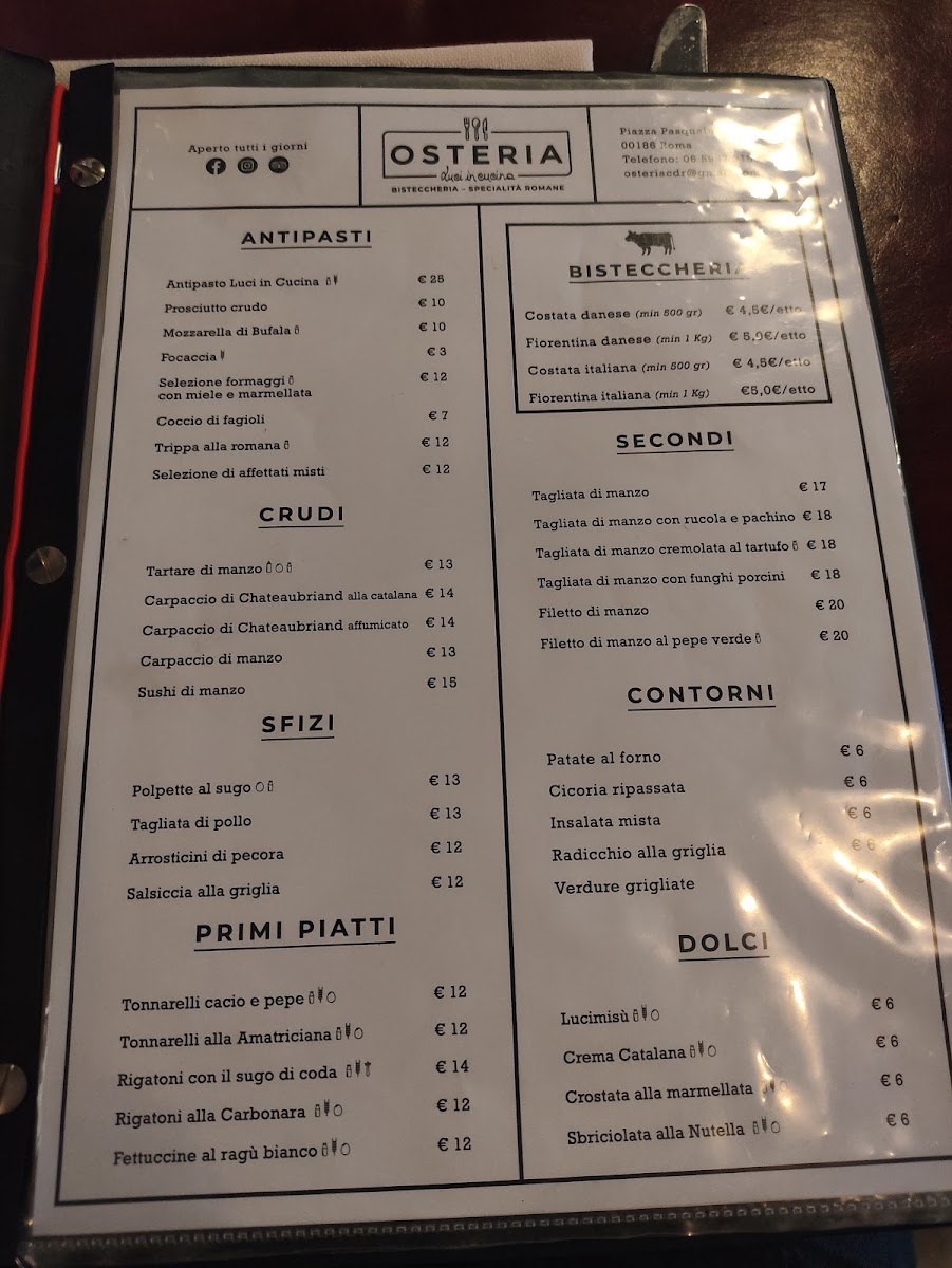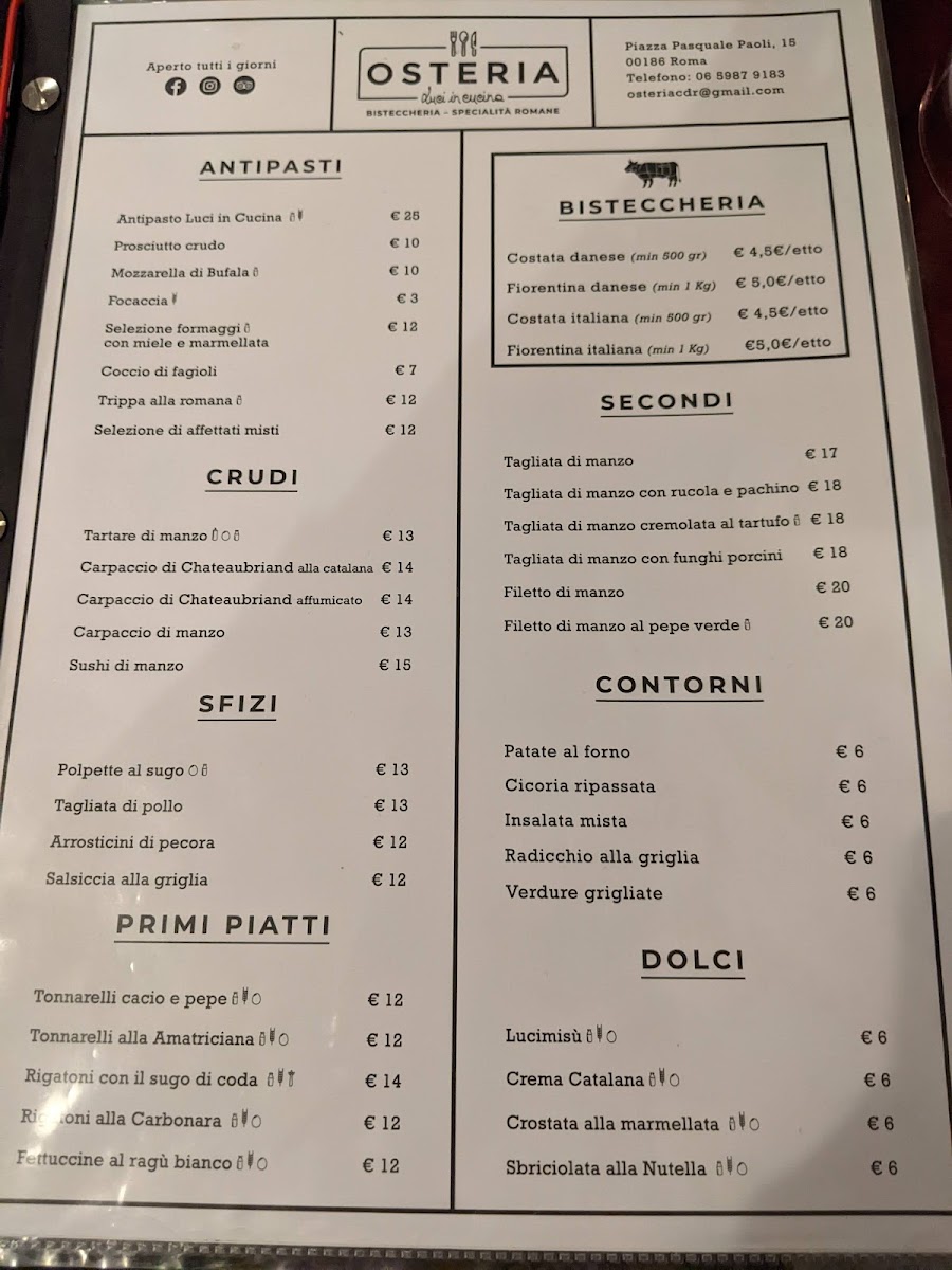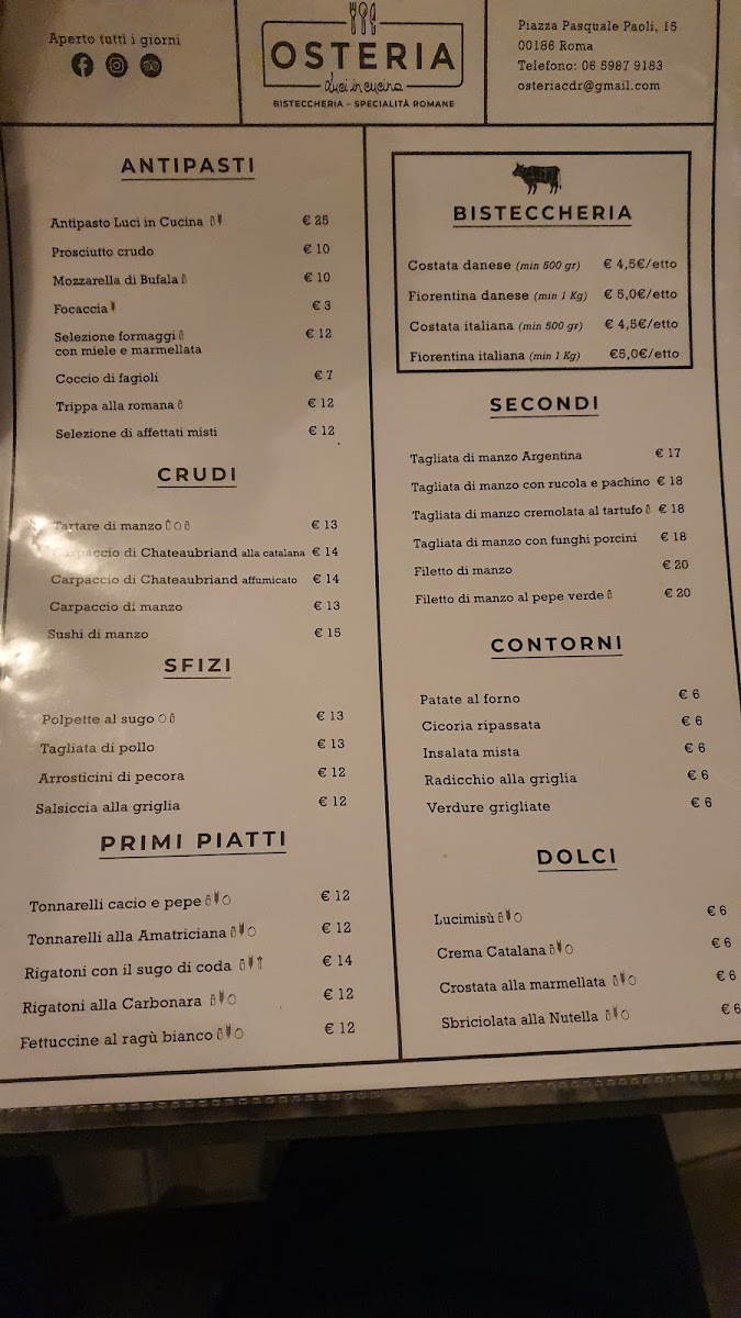Introducing the menu of Osteria Luci in cucina, a gem nestled in the vibrant heart of Rome at Piazza Pasquale Paoli. Here, traditional Italian fare comes to life with a delightful selection of primi piatti like Tonnarelli al cacio e pepe and Rigatoni alla carbonara, each priced at an appealing €13. The contorni, or side dishes, including Patate al forno and Cicoria ripassata, enhance the meal for just €6. And don't miss the sweet end to your culinary journey with their exquisite desserts, such as the renowned tiramisù and Crema catalana, both available for €6.